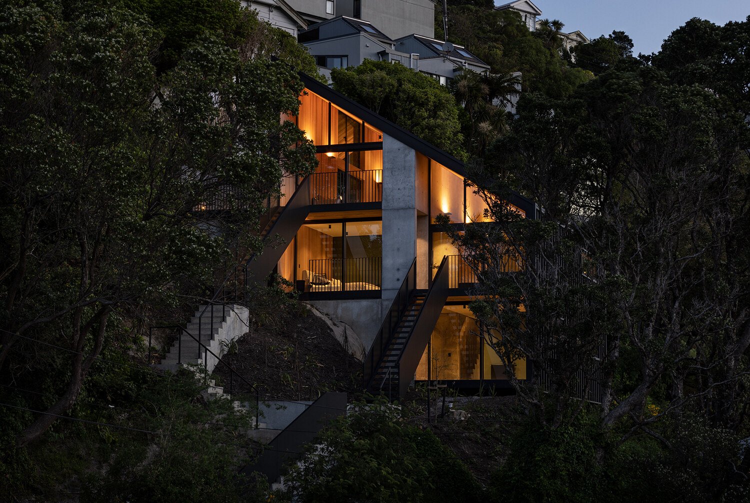 Situated on a hill overlooking Kelburn Viaduct in Wellington, the client wanted two beautiful, modest-sized townhouses built, that were separated by a three-storey, in-situ concrete party wall. The complex and intricate wall worked as a dividing partition between the two residences.
