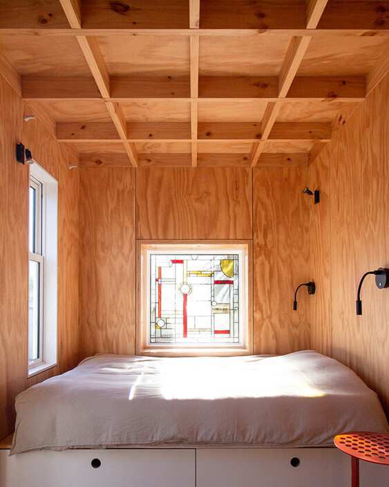 The space has been designed for efficient construction - the sides are two fibre cement panels wide, four panel long and one panel tall - allowing them to connect easily and to be built with very little waste. The interior was planned around an exposed timber waffle ceiling, where the roof framing forms a grid-like pattern.