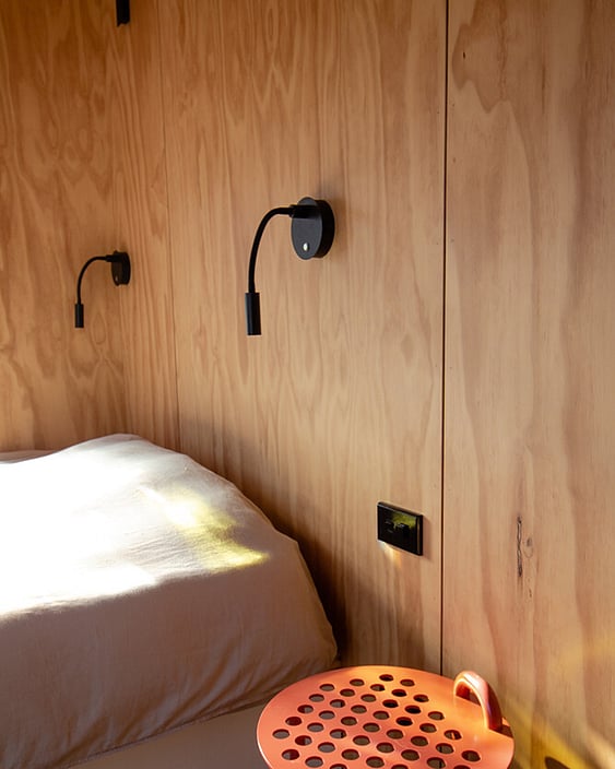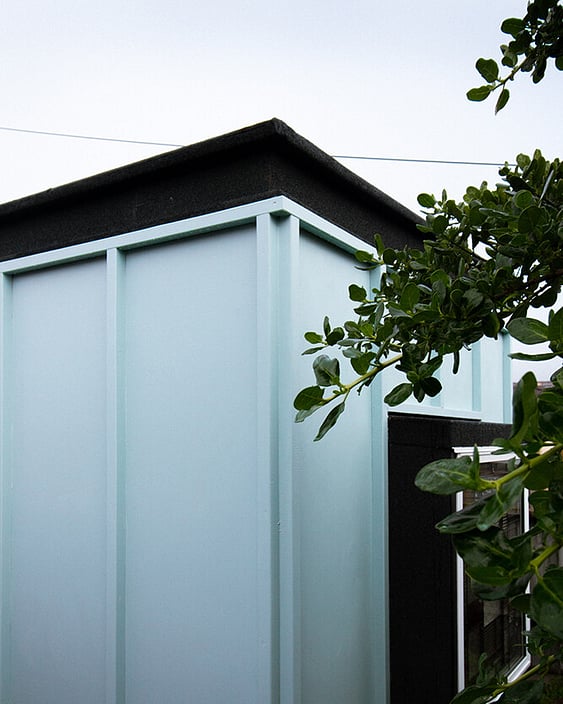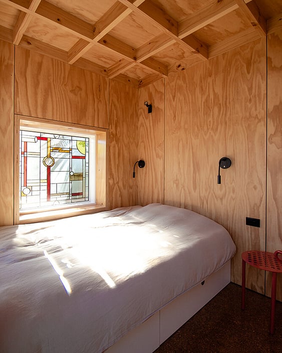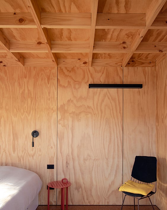 The space has been designed for efficient construction - the sides are two fibre cement panels wide, four panel long and one panel tall - allowing them to connect easily and to be built with very little waste. The interior was planned around an exposed timber waffle ceiling, where the roof framing forms a grid-like pattern.
